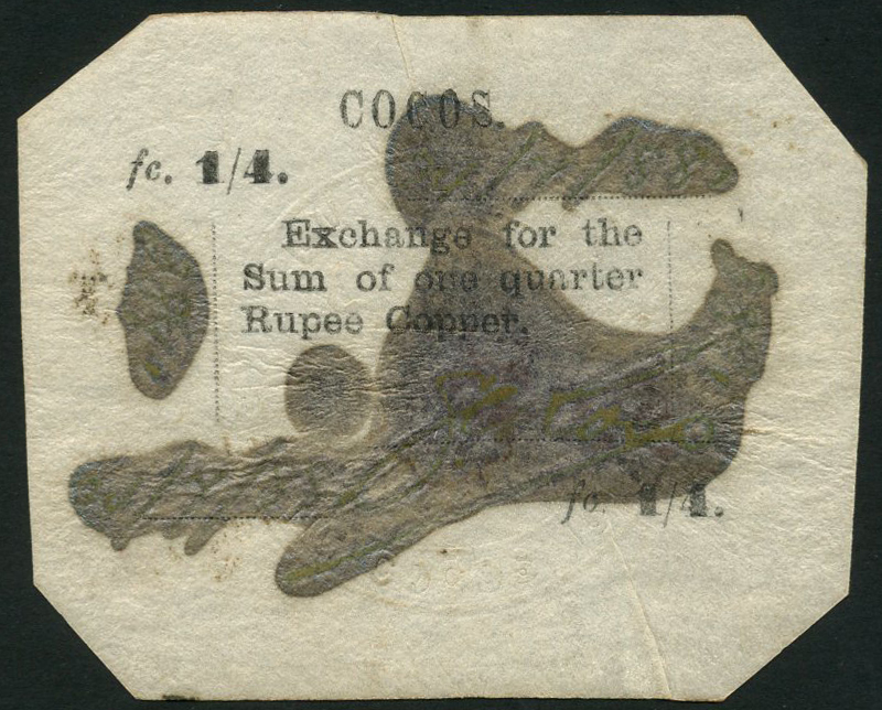 (x) Keeling-Cocos Islands, 1/4 rupee, 24 July 1888, black text on vellum, manuscript date, serial numbers and signatures