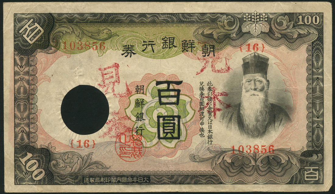 Bank of Chosen, specimen 100 yen, ND (1938), serial number {16} 103856, black on green and red underprint, bearded man at right, value at each corner, large cancellation hole at left, red Mi-hon overprints,