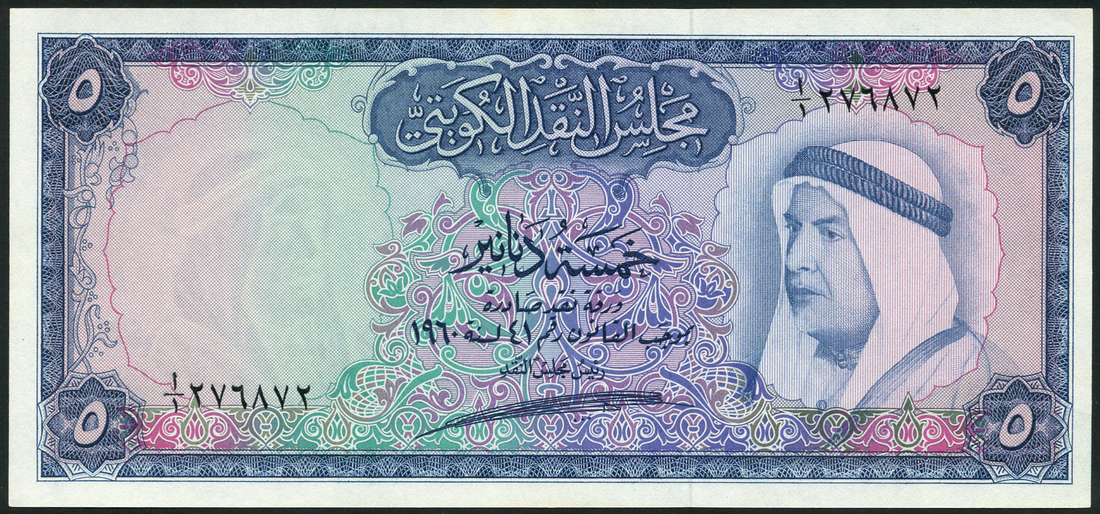 Kuwait Currency Board, 5 dinars, 1960, serial number I/1 276872, blue on multicolour underprint, Sheikh Abdullah Al-Salem Al-Saba at right, value at each corner