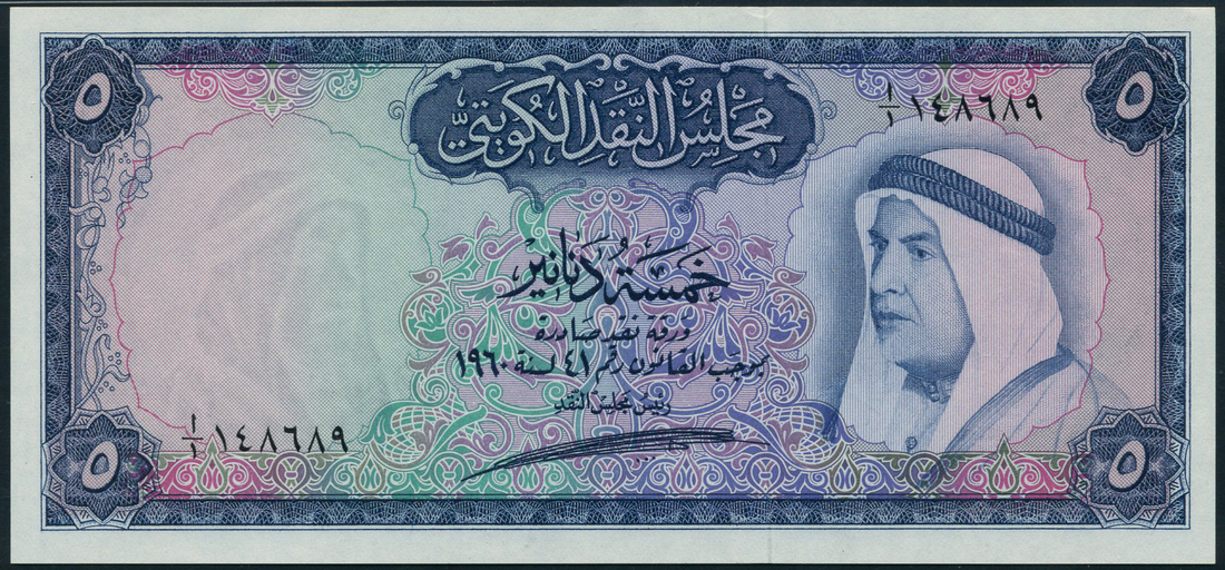 (x) Kuwait Currency Board, 5 dinars, ND (1961), serial number A/1 148689, blue on multicolour, A.S Abdullah at right, reverse blue, view of street
