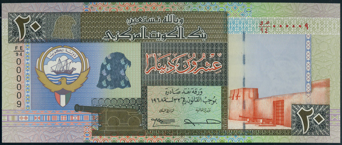 (x) Central Bank of Kuwait, a full set from the 1968 "Fifth" Issue, comprising 1/4, 1/2, 1, 5, 10 and 20 dinars, all with the serial number 000009, coat of arms at left, falcon watermark at right,