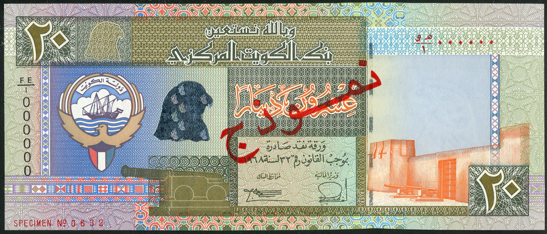 (x) Central Bank of Kuwait, a complete specimen set of the 1994 issue, comprising 1/4, 1/2, 1, 5, 10 and 25 dinars, all with zero serial numbers, all multicoloured, arms at centre left, red SPECIMEN overprints in Arabic and English