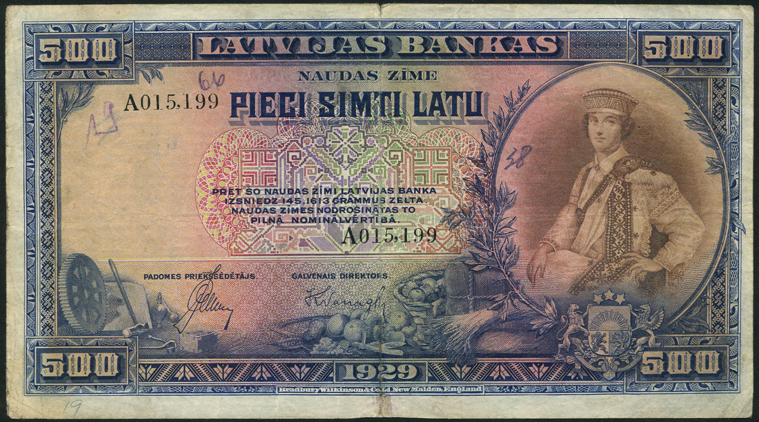 Government Currency note, Latvia, 20 latu, 1925, red serial number 037761, green and black, J. Cakste at centre, value at centre and at each corner, reverse green, arms at centre, value at left and right, also 25 latu, 1928, red serial number B350230, black and pale orange, Valdemars at centre, reverse blue, arms and value, plus 500 latu, 1929, black serial number A 015199, blue and multicoloured, girl in National costume at right, allegorical symbols of harvest and Industry below, value top centre and at each corner, reverse blue, green and orange, pastoral scene at centre, caduceus at left and right, value to left and right, 25 latu, 1938, red serial number A 372671, green and lilac, Lacplesis at right, 100 latu, 1939, green serial number A 152314, purple, allegorical farming family, also 50 latu, 1934, serial number 850969, blue and multicoloured, also Latvian Government Currency notes, 5 rubli (4), ND (1919), red serial numbers, blue, maiden at centre, value at left and right, also German Occupation Point Token, Latvia, 10 punkte, 30 April 1945, green and black, man in circular frame at left, woman shearing sheep at right, reverse, black text