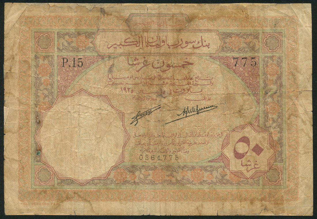 (x) Banque de Syrie et du Grand-Liban, Lebanon, 50 piastres, 1925, serial number P.15 775, pink-brown and multicoloured, value in maroon low right, Forges and Laferriere signatures, reverse green and multicoloured, courtyard viewed through an ornate gateway at left, GRAND-LIBAN in blue at centre