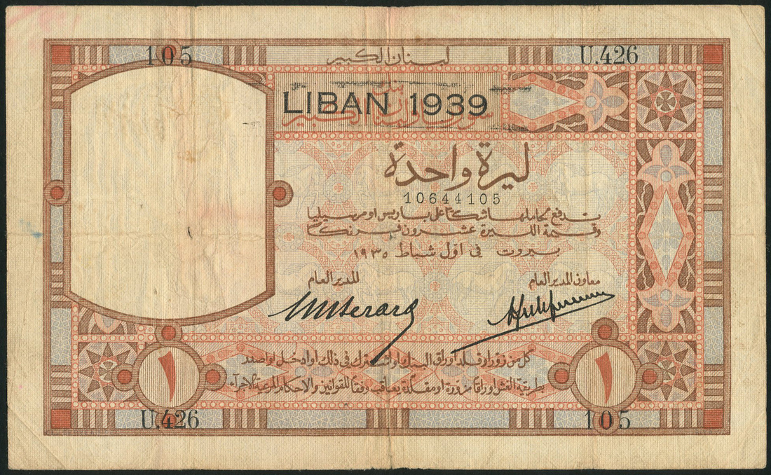 Banque de Syrie et du Grand-Liban, Lebanon, 1 livre, 1939 (old date 1935), serial number U.426 105, multicolour, ornate border, value low left and right, black LIBAN 1939 overprint top centre, Berard and Laferriere signatures, reverse, blue and reddish brown, harbour and mountains in background, GRAND-LIBAN in blue top centre, numerous folds, minute hole at centre and centre right, some discolouration, very good or better