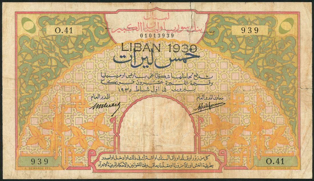 (x) Banque de Syrie et du Grand Liban, Lebanon, 5 livres, 1935, serial number O.41 939, green, orange and multicolour, geometric patterns, Berard and Laferriere signatures, reverse, multicoloured, Great Court of Haremlik at Hazem's Palace in Damascus at centre, ornate scrollwork in field, red LIBAN top centre