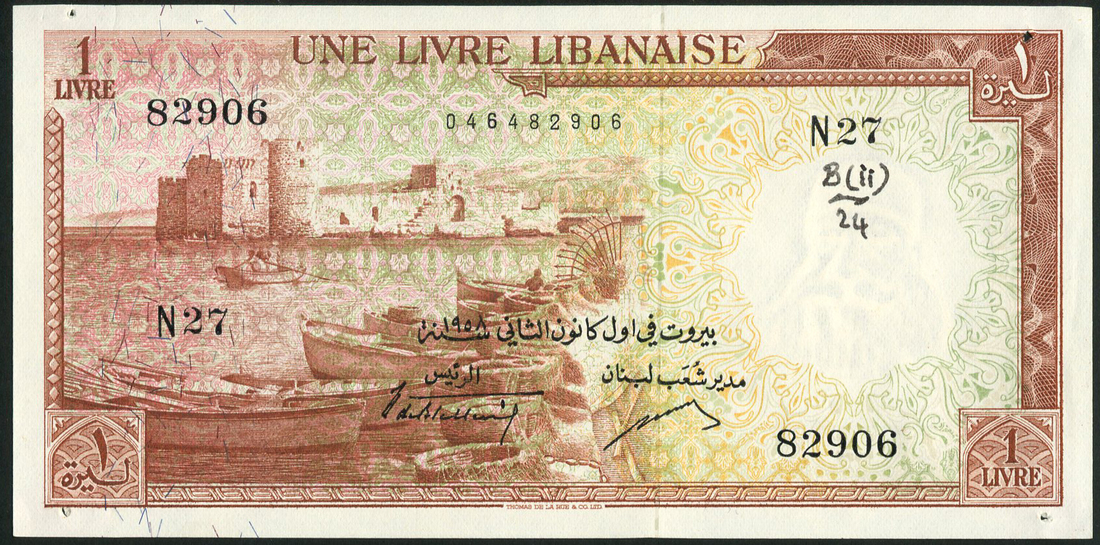 Republique Libanaise, 5 piastres, 15 July 1942, no serial number, lilac and green, Cedar of Lebanon tree at right, red stamped ANNULE centre, handwritten "65/" at right, reverse blue, also Banque de Syrie et du Liban, Lebanon, specimen 1 livre (3), 1958, serial numbers N27 82904/05/06, brown, pale green, orange and white, the Crusader Castle at Saida (Sidon) at left, reverse the Pillars of Baalbek