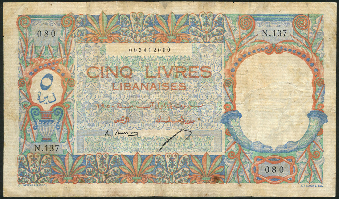 (x) Banque de Syrie et du Liban, Lebanon, 5 livres, 1945, serial number N.137 080, blue and red-brown, conjoined drinking horns at right, urn at left, ornate scroll work around, value at left, Busson and Letayf signatures, reverse pale blue and multicoloured, a view of Ras Beirut, value low centre and at each corner