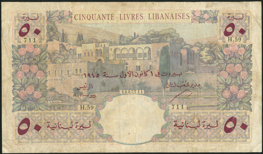 (x) Banque de Syrie et du Liban, Lebanon, 50 livres, 1945, serial number H.59 711, pale blue, mauve and multicoloured, the Beiteddin Palace at centre, roses at left and right, value in maroon top left and right, Busson and Letayf signatures, reverse pale blue and multicoloured, the Roman Temple of Bacchus at centre, grapes at right, olives at left