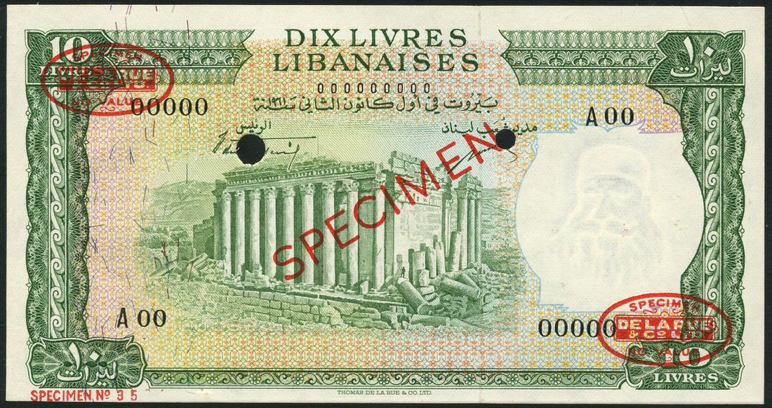 Banque de Syrie et du Liban, specimen 10 livres, 1961, black zero serial numbers, green on multicolour underprint, Temple of Bacchus at centre, value at each corner, reverse, green, shoreline and city