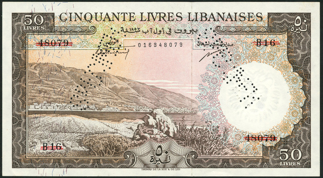Banque de Syrie et du Liban, specimen 50 livres, 1952, serial number B16 48079, brown on multicolour underprint, coastal landscape at left, reverse, rock formations in water, value at each corner