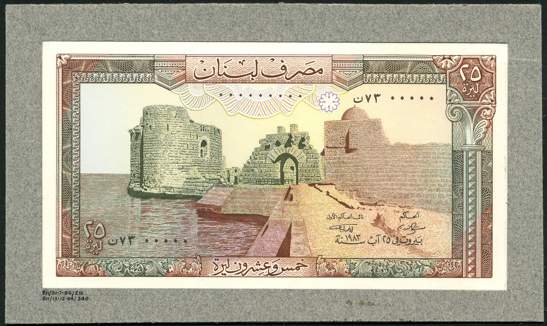 (†) Banque du Liban, an obverse archival printers essay for a 25 livres, 1983, zero serial numbers, purple and green, the citadel and Mosque in the Port of Saida, Oughurlian and El Khoury signatures