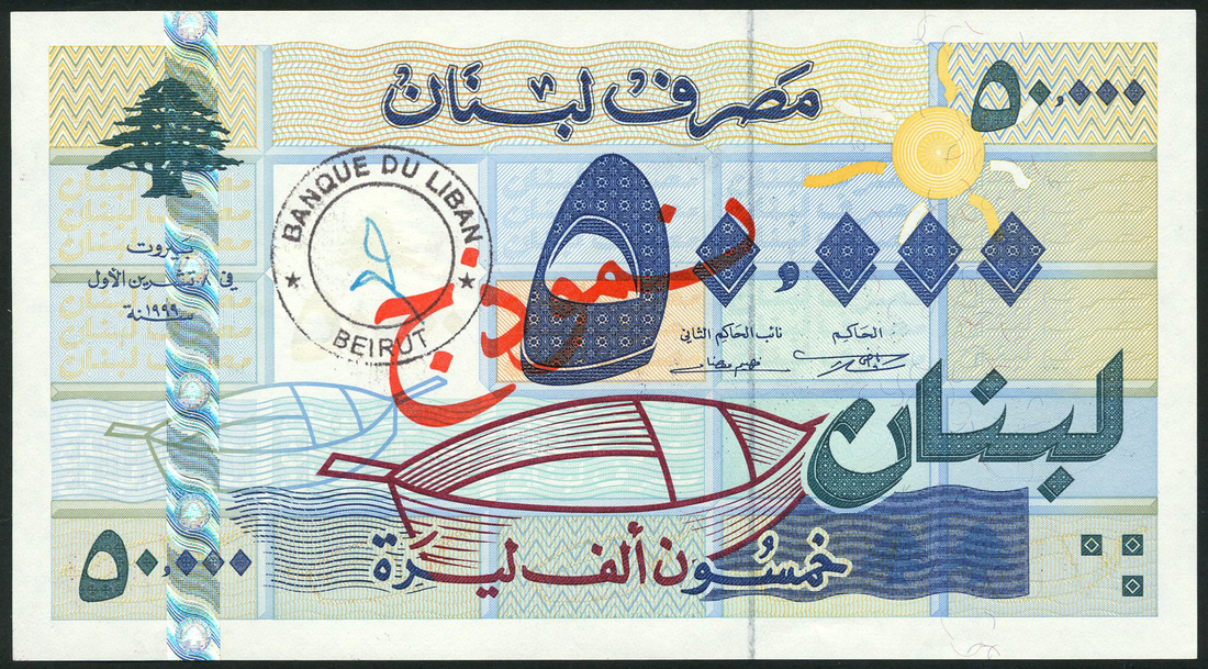 Bank of Lebanon, 20,000 livres, 1999, serial number D00000000 multicolour, two stylised boats at left on geometric block design, red SPECIMEN overprint, handstamp over watermark two stylised boats at left on