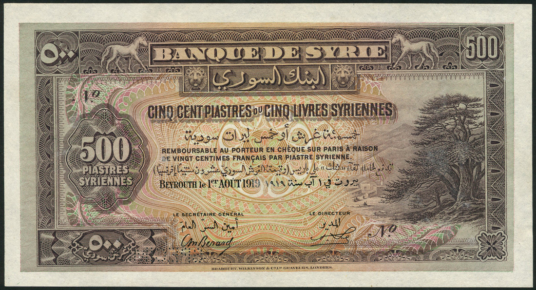 (x) Banque de Syrie, specimen 5 piastres, green, lilac and orange, the pillars of Baalbek low centre, Berard and green and pale orange, the ruins at Baalbek low centre, specimen 25 piastres, 1 August 1919, blue and pale brown and pink, specimen 50 piastres, purple, green and orange, Sultanieh top centre, specimen 100 piastres, purple and green, the Pillars of Baalbek at left and specimen 500 piastres, purple and pale green and orange, Cedar tree at right, all 1 August 1919, all no serial numbers, all Berard and Stobert signatures