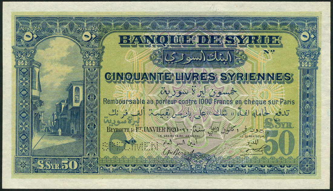 Banque de Syrie, specimen 50 livres, 1 January 1920, no serial numbers, blue, green and orange, street scene at left, Berard and Stobert signatures, reverse purple, green and mauve, dhows at centre