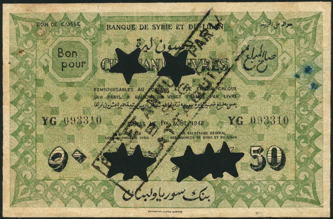(x) Banque de Syrie et du Liban, Syria, specimen 50 livres, 1 August 1942, serial number YG 093310, dark green on light green underprint, ornate border, bank title top centre