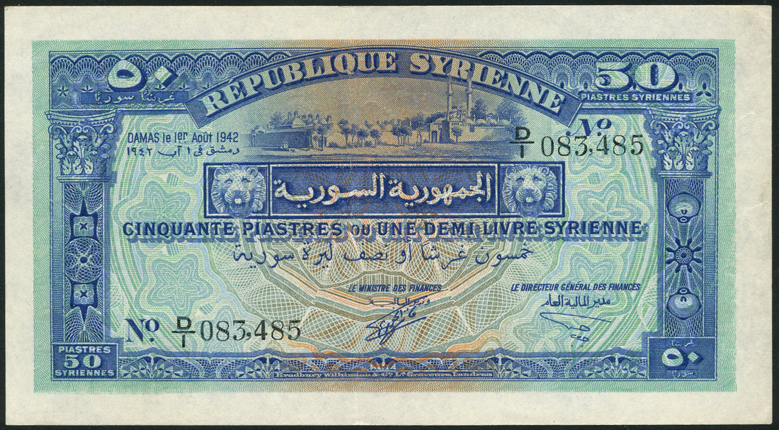 (x) Republique Syrienne, 25 piastres, 1 August 1942, serial number C/3 402,352, red and multicolour, Omayyad Mosque in Damascus at low centre, reverse, red and olive green, also, 50 piastres, 1 August 1942, serial number D/1 083,485, blue and multicolour, view of Damascus upper centre, reverse, multicolour ornate pattern