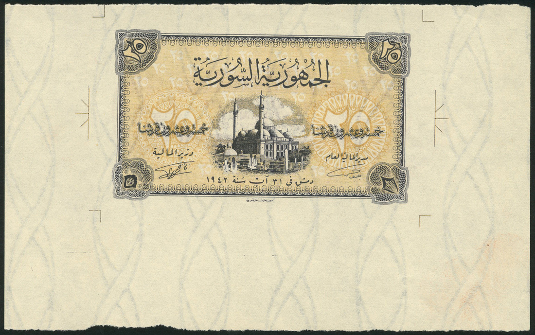 (x) Republique Syrienne, Syria, a large format proof 25 piastres, 1942, brown and light yellow, Mosque of Si Kabib of Homs at centre, value top left and right, reverse blue-green, value at centre and low left and right