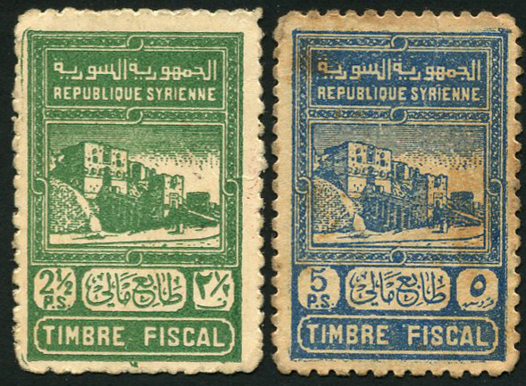 (x) Republique Syrienne, Syria, 2 1/2 piastres, ND (1945 provisional issue), green tax adhesive stamp affixed to cardboard, reverse, red text, 5 piastres, ND (1945 provisional issue), blue tax adhesive stamp affixed to card, reverse, red text