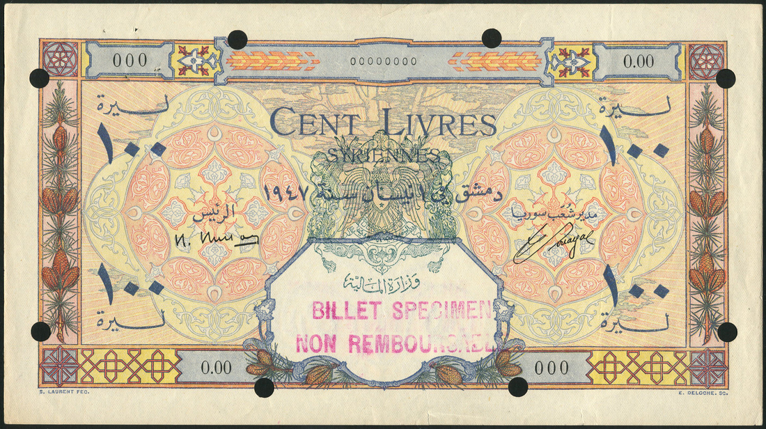 (x) Banque de Syrie et du Liban, Syria, specimen 100 livres, 1 April 1947, zero serial number, multicolour, ornate border, value at each corner, state arms at centre with cedar tree in background, Bouson and Souyal signatures, reverse, Damascus scene at centre with incense burners at either side
