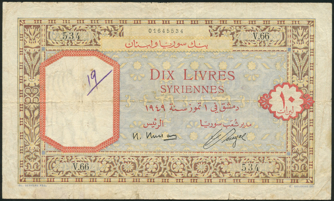 (x) Banque de Syrie et du Liban, Syria, 10 livres, 1949, serial number V.66 534, pale pink-brown and light blue, value in red at centre right, Busson and Souyal signatures, reverse, multicolour, Temple of Mercury at centre, value in red at each corner