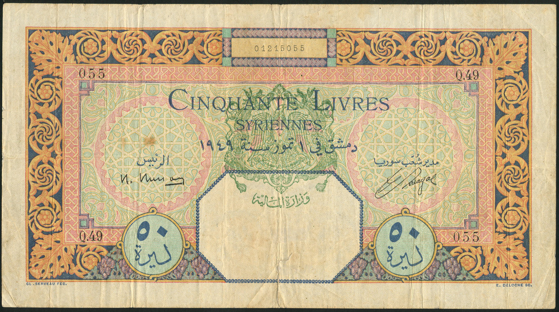 (x) Banque de Syrie et du Liban, Syria, 50 livres, 1 July 1949, serial number Q.49 055, pale pink, green and multicoloured, value in blue bow low left and right, green Republic seal at centre, ornate border, Busson and Souayal signature, reverse, multicolour, house at centre