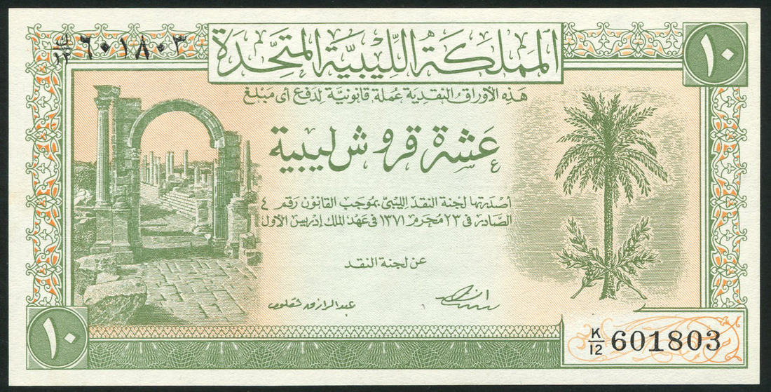 United Kingdom of Libya, 5 piastres (2), ND (L.1951), serial numbers L/10 811442, L/10 811445, red on pale yellow underprint, 10 piastres, ND (L.1951), serial number K/12601803, light green on pale orange underprint