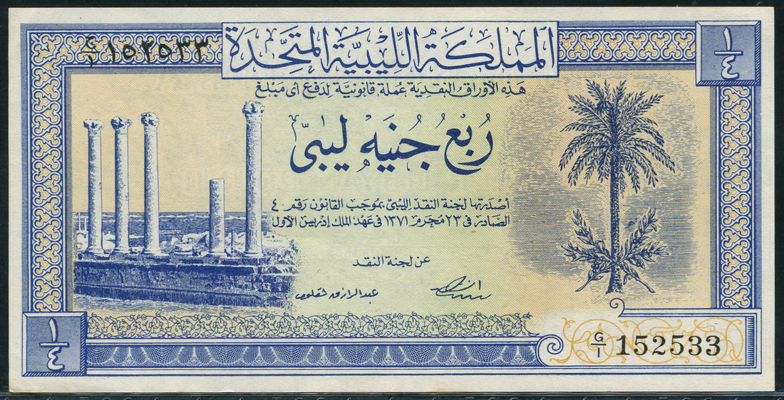 (x) United Kingdom of Libya, 1/4 pound, 24 October 1951, serial number G/1 152533, blue on ochre underprint, Temple ruins at left, arms at right