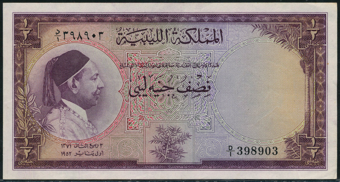 (x) Kingdom of Libya, 1/2 pound, 1 January 1952, serial number D/1 398903, purple on multicolour underprint, King Idris at left