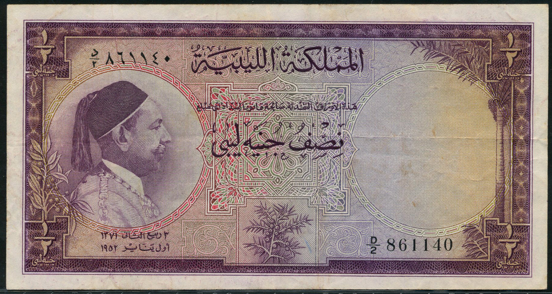 (x) Kingdom of Libya, 1/2 pound, 1 January 1952, serial number D/2 861140, purple on multicolour underprint, King Idris at left