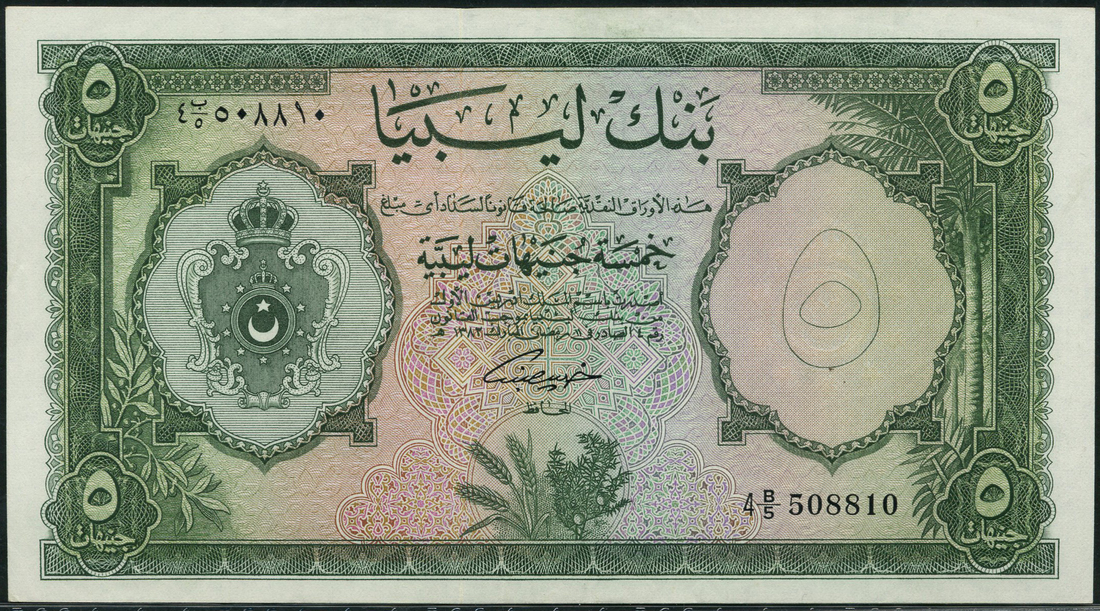 (x) Bank of Libya, 5 pounds (2), 5 February 1963, serial numbers 4 B/5 508810, green on multicolour underprint, arms at left, value at each corner