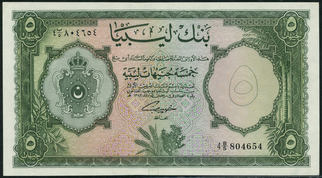 (x) Bank of Libya, 5 pounds, 5 February 1963, serial numbers 4 B/5 804654, green on multicolour underprint, arms at left, value at each corner