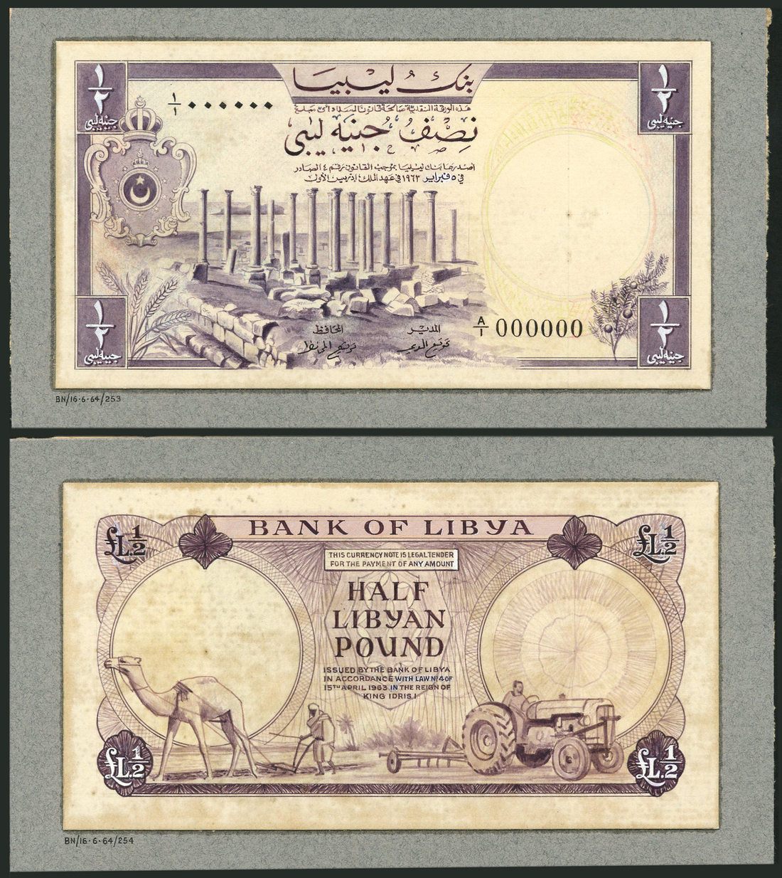 (†) Bank of Libya, a printers obverse and reverse archival composite essay on board for a proposed issue of a 1/2 Libyan pound, brown and mauve, the Pillars of Baalbek at left centre, arms at left, plant low right, value at each corner, reverse camel and plough at left, tractor at right, value at centre and at each corner