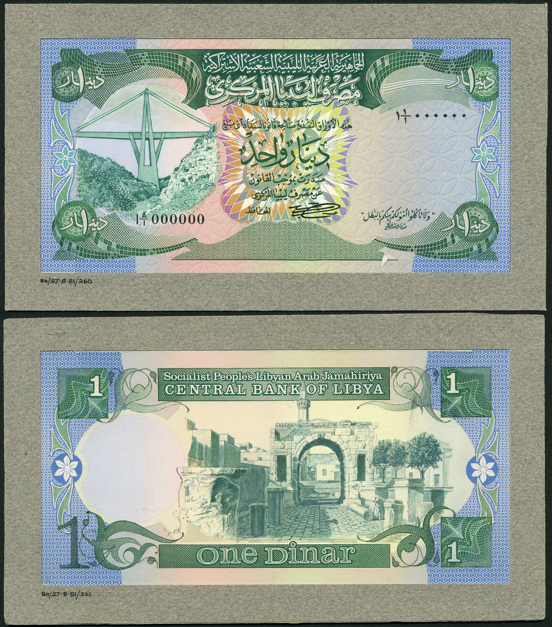(†) Socialist People's Libyan Arab Jamahiriya, Central Bank of Libya, a printers obverse and reverse archival composite essay on card for a proposed issue of 1 dinar, ND (1981), serial number 1 A/1 000000, green and multicoloured, suspension bridge at left, ornate background detail, signature of Kasem M.Sherlala low centre, reverse green and blue, ancient ruins at centre, value in field