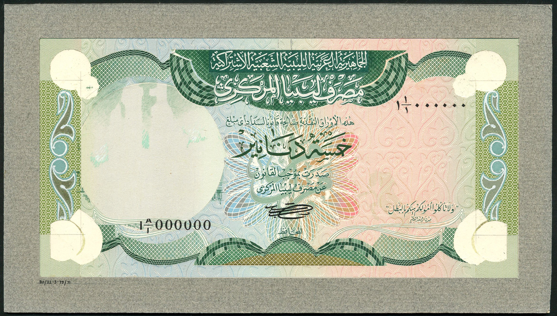 (†) Central Bank of Libya, a printers archival partial obverse and reverse composite essay on card for a proposed issue of 5 dinars, ND (1981), serial number 1 A/1 000000, green and multicoloured, signature of Kasem M.Sherlala low right centre, reverse green and pale mauve, value low left