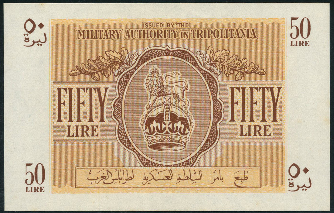 (x) Military Authority in Tripolitania, Libya, 50 lire, ND (1943), no serial number, brown on yellow underprint, lion on crown at centre, 10 lire, ND (1943), no serial number, purple on green,