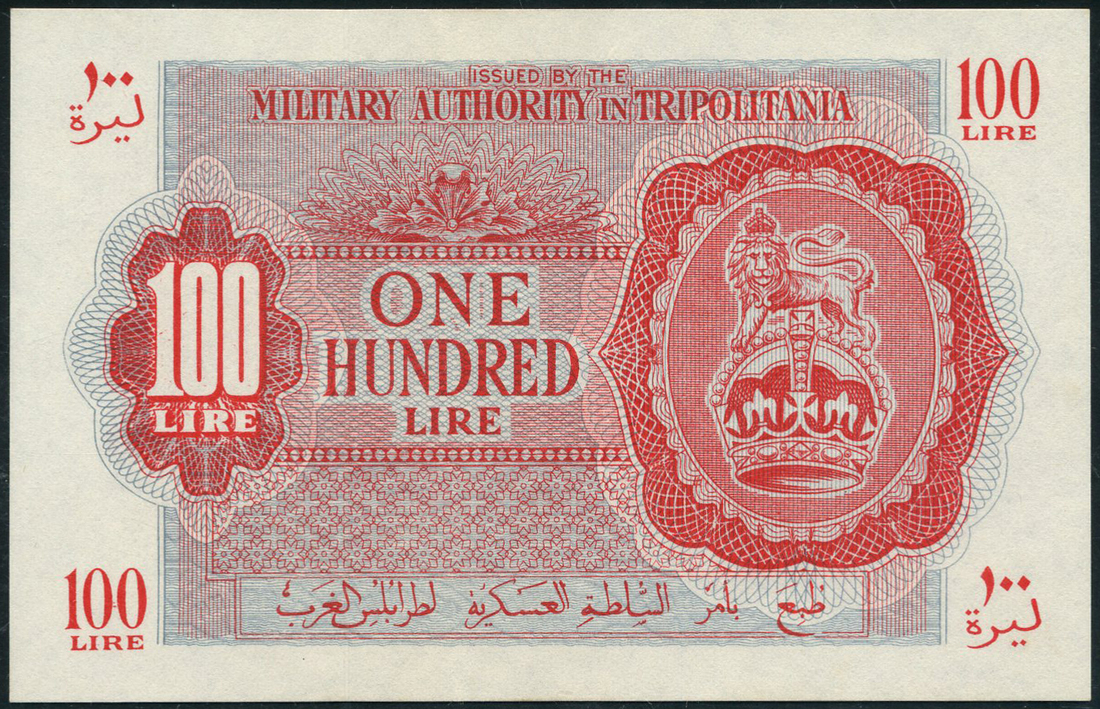 (x) Military Authority in Tripolitania, Libya, 100 lire, ND (1943), no serial number red on blue underprint, lion on crown at right