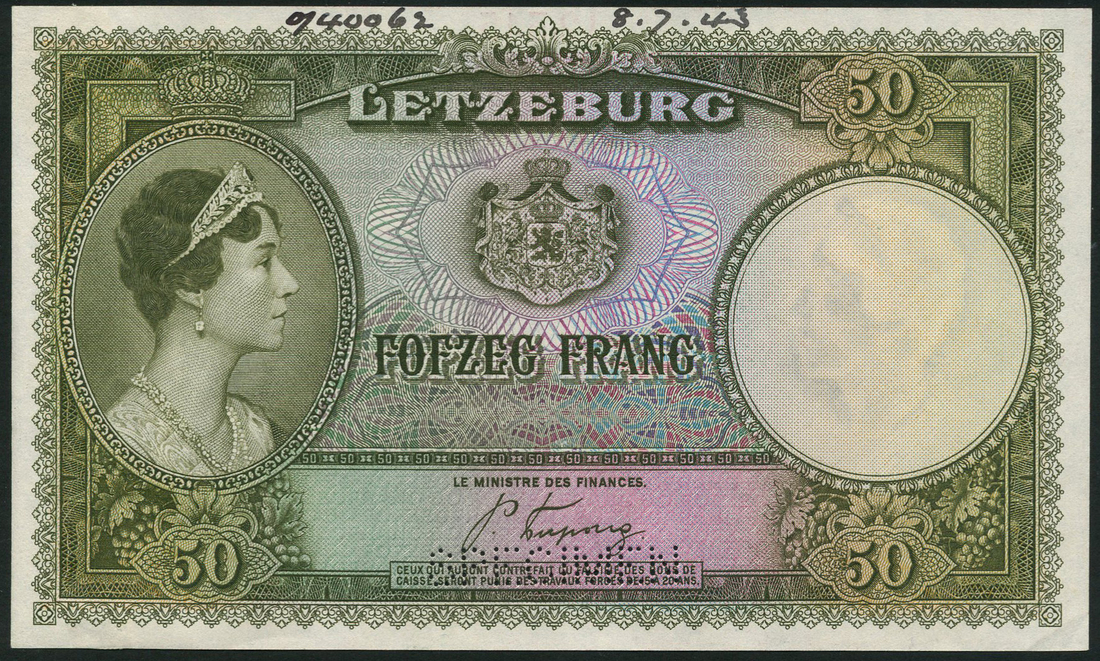 (†) Grand Duche de Luxembourg, Letzeburg, printer's archival specimen 50 Francs, ND (1944), red serial number run B 000,001 to B 400,000, deep grey-green on multicoloured underprint, portrait of Grand Duchesse Charlotte at left, arms at upper centre, reverse Vianden Castle, without wording and guilloche at lower centre, perforated SPECIMEN