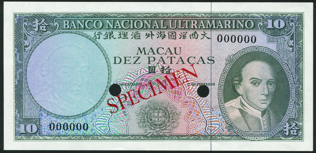 Banco Nacional Ultramarino, Macau, colour trial 10 patacas, ND (type of 1963), zero serial numbers, green, mauve and multicoloured, Carneiro at right, arms low centre, value at centre and at each corner, reverse green and multicoloured, maiden and ships, ship seal at left