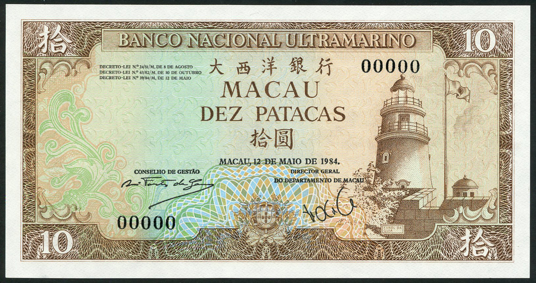 (†) Banco Nacional Ultramarino, Macau, specimen 10 Patacas (3), 12 May 1984, zero serial numbers, brown on multicolour underprint, lighthouse, fortress wall and flag at right, arms at low centre, one of each signature variety for this date