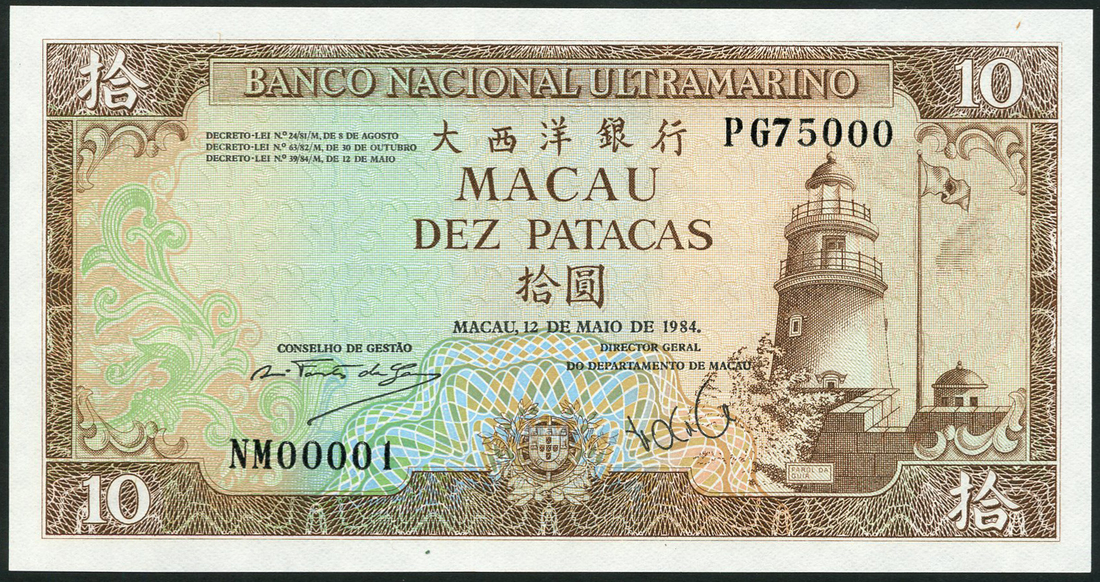 (†) Banco Nacional Ultramarino, Macau, printers archival specimen 10 Patacas (3), 12 May 1984, serial number runs NM00001-PG75000, PH00001-QY75000 and QZ00001-SQ75000, brown on multicolour underprint, lighthouse, fortress wall and flag at right, arms at low centre, one of each signature variety for this date