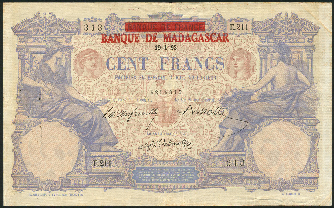 Banque de Madagascar, 100 francs (3), 1926, prefixes E, K and V, blue on red underprint, seated female allegories at left and right, red bank overprint at top centre