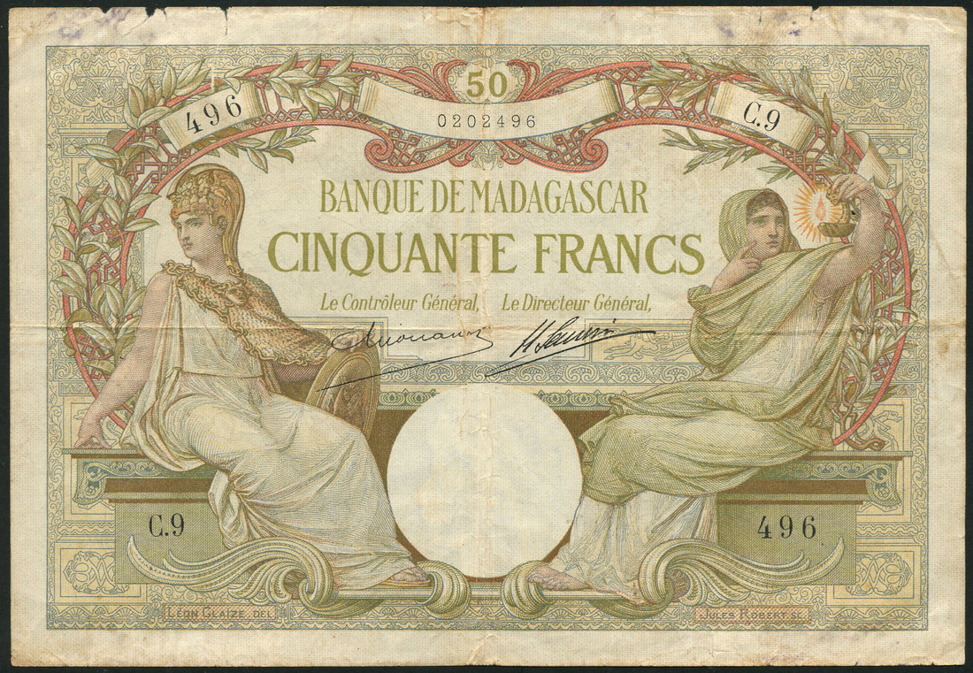 Banque de Madagascar, 50 francs (2), ND (1926 and 1948), serial numbers C.9 496 and W.696 199, green, red and blue on multicolour underprint, seated female allegories at left and right