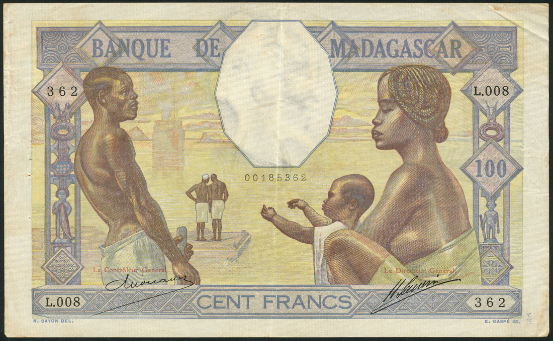 Banque de Madagascar, 100 francs, ND (1926), serial number L.008 362, multicoloured, Malagasy family at left and right, value at low centre and right, reverse Malagasy men working with teams of zebu cattle