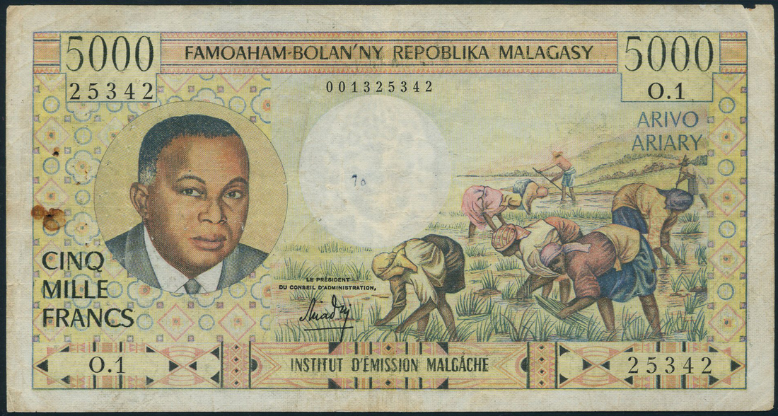 Institut d'Emission, Malagasy Republic, a group of notes comprising, 100 francs (2), ND (1961), consecutive serial numbers T.2618 872/3, multicolour, fruit at left, Queen's Palace in Antananarivo, women carrying urns, Merina woman at right, reverse, woman at left, sailboats at centre, zebu cattle at low right, 500 francs, ND (1966), serial number R.6 78862, multicolour, woman at left, ornately carved columns at right, reverse, purple and green, flower at left, palm at right, 1000 francs, ND (1966), serial number C.11 89265, multicolour, man and women at left, signature 3, 5000 francs, ND (1966), serial number O.1 25342, multicolour, portrait President Philibert Tsiranana at left, harvesting scene at centre and right, signature 3, reverse, woman holding child, fields, trees and mountains in background, together with a mixed group of notes comprising, 10 francs (2), 50 francs (2), 100 francs (6), 500 francs and 1000 francs