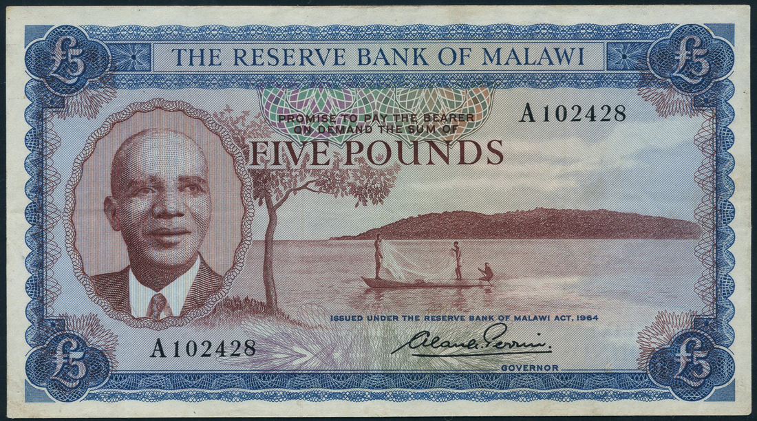 Reserve Bank of Malawi, £5, ND (1964), serial number A102428, blue and red-brown, Hastings Banda at left, fisherman and canoe at centre right, value at each corner