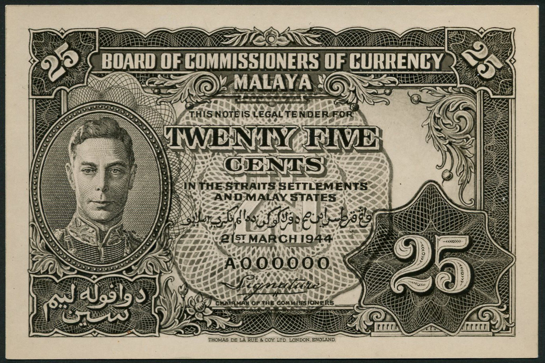 (x) Board of Commissioners of Currency, Malaya obverse and reverse black and white photographic style proofs for a 25 Cents, 21 March 1944, serial number A000000, portrait of King George VI at left, value at lower right, reverse arms of the Malay States, value at lower left and right