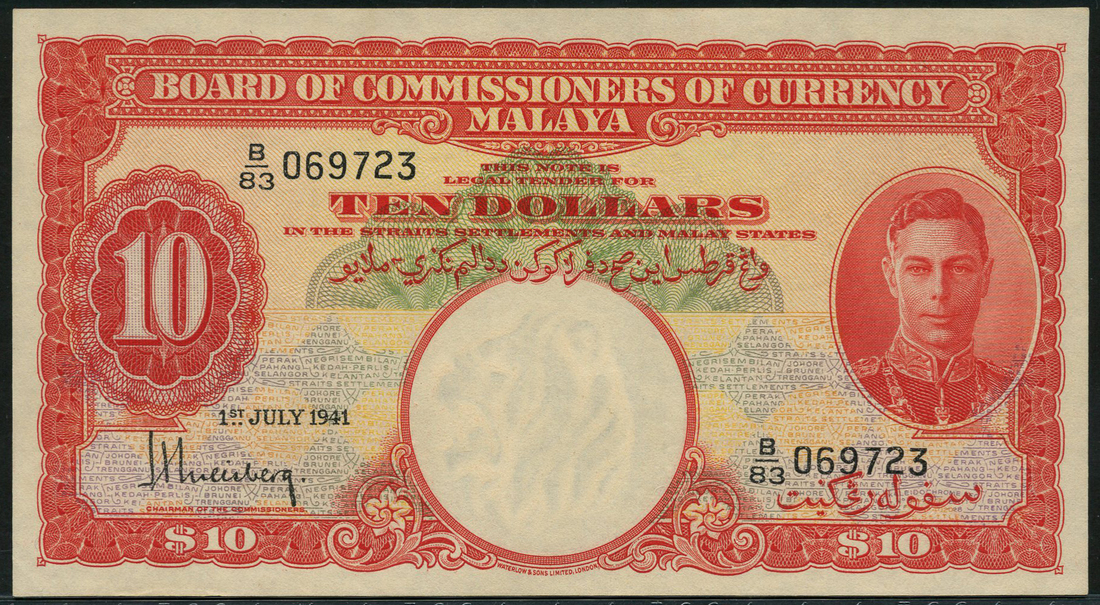 (x) Board of Commissioners of Currency, Malaya, $10, 1 July 1941, serial number B/83 069723, red on yellow, blue and green underprint, George VI at right, value at left, reverse red, 11 coats of arms