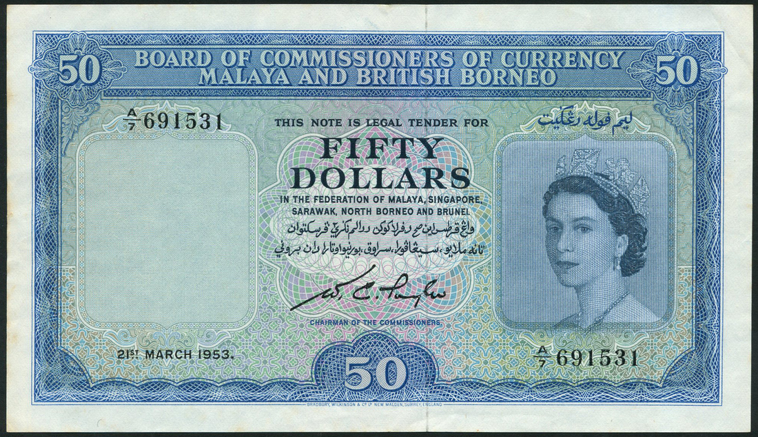 Board of Commissioners of Currency, Malaya and British Borneo, $50, 21 March 1953, serial number A/7 691531, blue on multicolour underprint, Elizabeth II at right, value at low centre and top left and right, reverse dark blue, 16 coats of arms