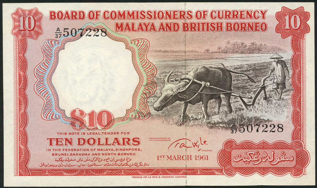 Board of Commissioners of Currency, Malaya and British Borneo, $10 (2), 1 March 1961, serial numbers A/37 507227 and 507228, red and black on blue and green underprint, farmer ploughing with water buffalo at right, reverse red, five coats of arms